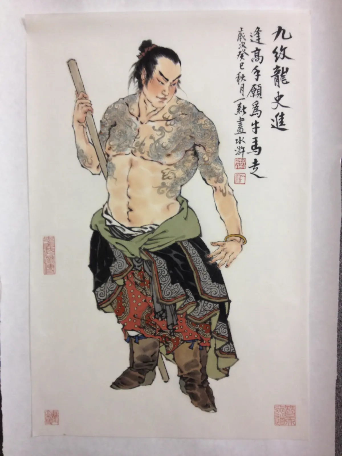 A tetoválásnak a törvényen kívüliséggel való asszociációja a négy kínai klasszikus regény egyikében is szerepet kap. A Vízparti történet egyik szereplője, a mocsári betyárok egyike, Shi Jin (a magyar fordításban Si Csin) a testére tetovált kilenc sárkányról kapta becenevét, így lett „Kilencsárkányos” (九纹龙 szó szerint kilenc tetovált sárkány vagy kilenc csíkos sárkány). Bár a törvényen kívüliség, a lázadás jelenik meg a regényben, a betyárok mégis „jófiú” szerepben tűnnek fel, ezért a tetoválás nem a szereplők leírásának eszköze.